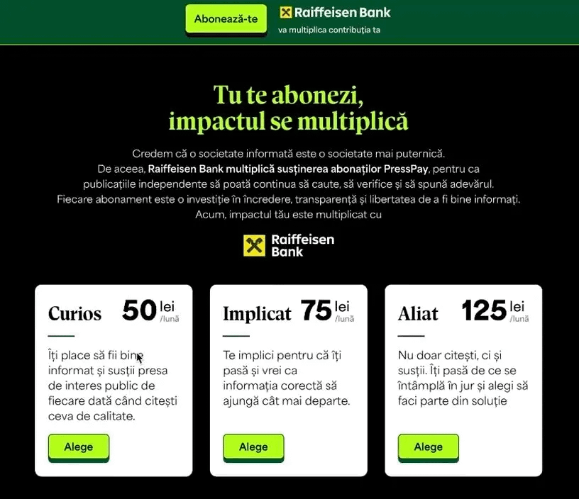 NU UITA! Orice abonament la PressPay.ro - proiect operat de Ethical Media Alliance - este amplificat din punct de vedere al impactului de Raiffeisen Bank.