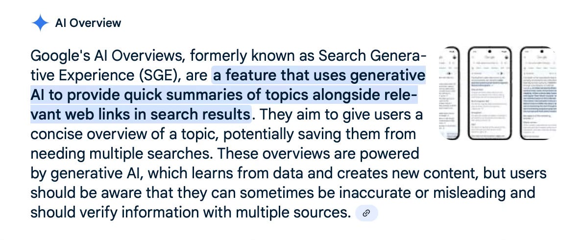AI Overviews – rezumate generate automat, afișate deasupra rezultatelor organice.