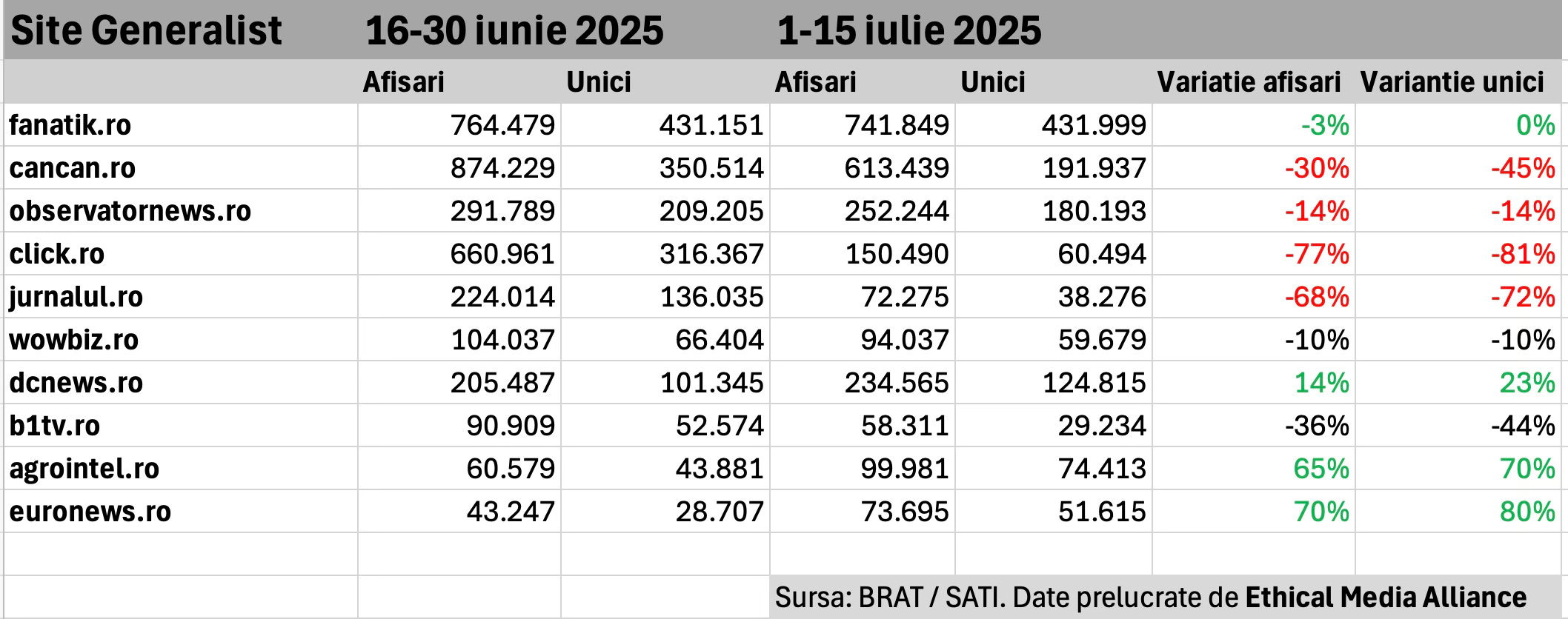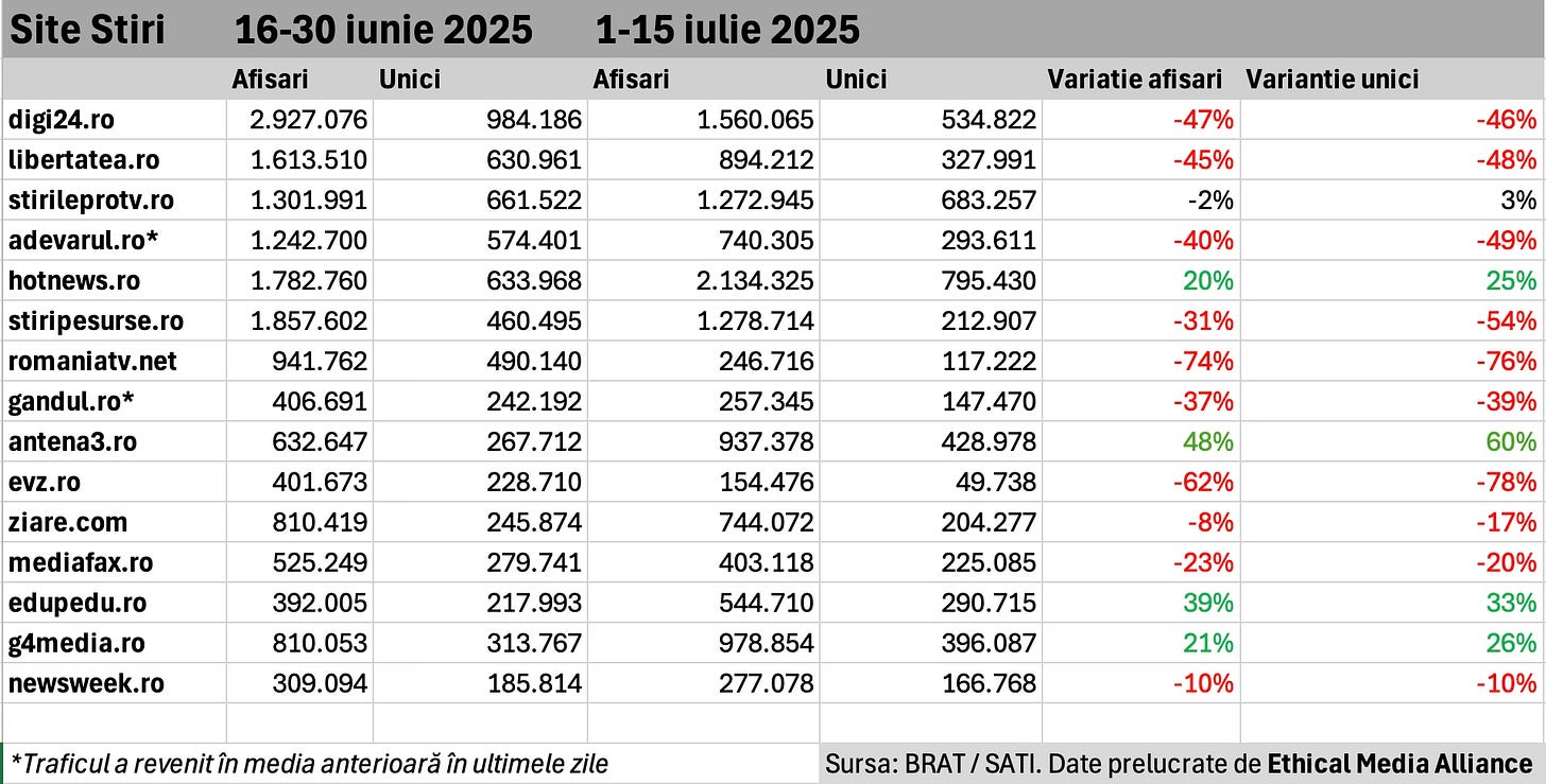 Scăderile din agregatoare de tip Google News si altele depășesc 30% dpdv afișări și 15% dpdv vizitatori unici.