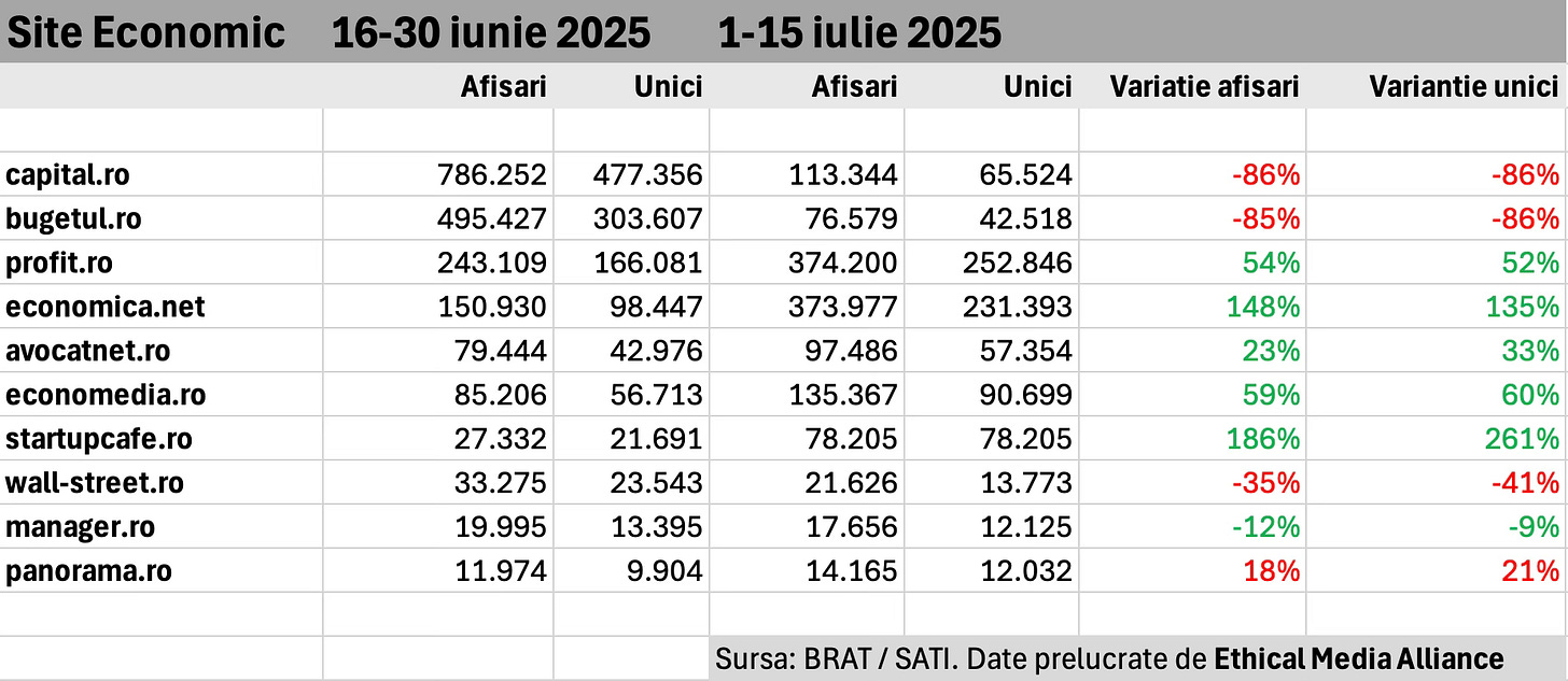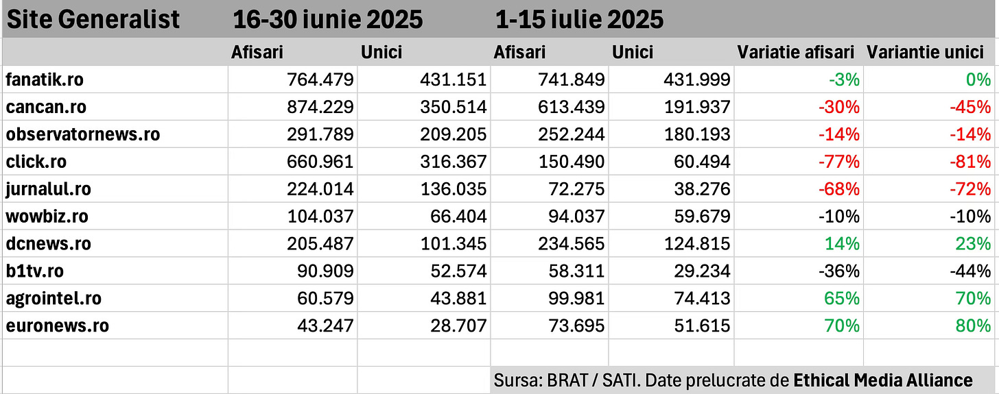 Atât în rețeaua comercială Thinkdigital - partenerul adtech si vânzări al Ethical Media AdNetwork - cât și din semnalele primite de la mai mulți publisheri locali, inclusiv unii care fac parte din Ethical Media Alliance, vedem o lună iulie foarte complicată din punct de vedere al traficului provenit din Google Search, News, Showcase, Discovery și, în general, din tot ce ține de universul Alphabet.