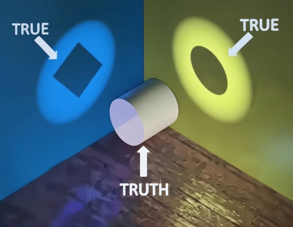 Două relatări incomplete pot fi corecte din perspectiva celor care le emit, dar doar parțial adevărate când sunt prezentate separat.